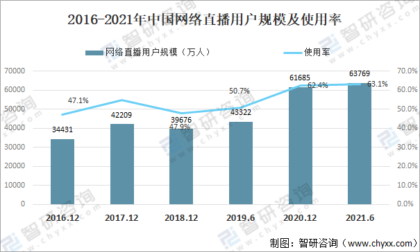 2020 年我国网络直播用户规模达61685万人,使用率为 62.4%;2021年中国网络直播用户规模为63769万人,使用率为63.1%。