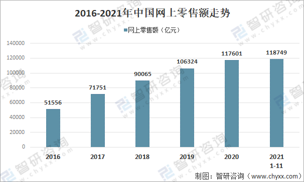 2016-2021年中国网上零售额走势