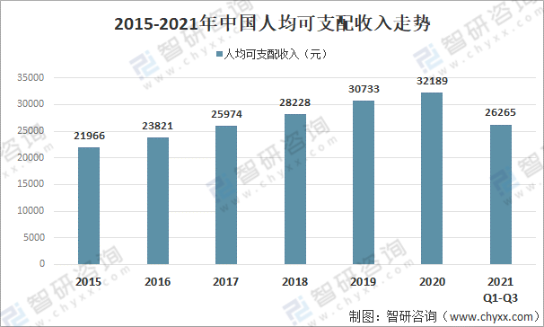 随着人们生活条件的提高,人均可支配收入的增加。2021年中国前三季度人均可支配收入为26265元。