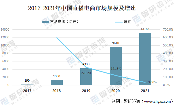 直播行业作为消费升级的新引擎,过去5年伴随着一批头部平台的成长迎来了蓬勃发展。2021年中国直播电商市场规模约为13165亿元,同比增长37%。