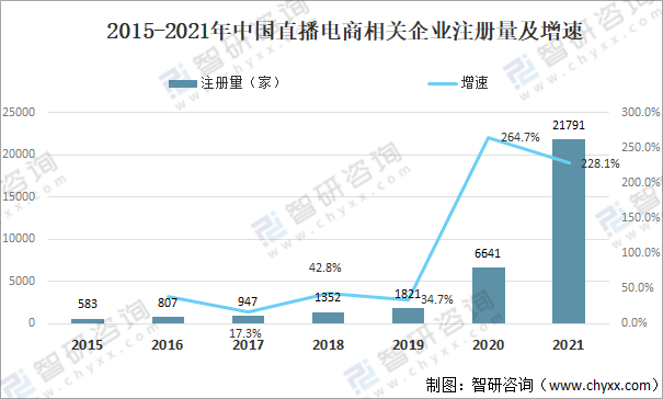 2015-2021年中国直播电商相关企业注册量及增速