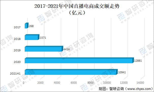 随着越来越多网红、明星加入直播电商大队,采用各种低价促销、直播间粉丝福利互动、明星种草同款等吸睛方式,引起大众注意,直播电商行业迎来爆发式增长。2021上半年中国直播电商成交额为10941亿元。