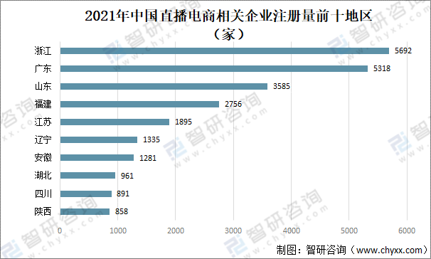 近几年直播电商企业注册量不断增长,2021年中国直播电商相关企业注册数量最多地区为浙江5692家;其次为广东地区直播电商相关企业注册数量5318家。