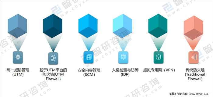 网络安全硬件市场分别由统一威胁管理(UTM)、基于UTM平台的防火墙(UTM Firewall)、安全内容管理(SCM)、入侵检测与防御(IDP)、虚拟专用网(VPN)、传统防火墙(Traditional Firewall)构成。
