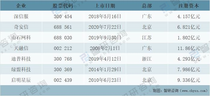 中国网络安全硬件市场上市企业主要有深信服、奇安信、山石网科、天融信、迪普科技、绿盟科技、启明星辰等,从上市时间来看,天融信上市时间要早于深信服、奇安信、山石网科、迪普科技、绿盟科技和启明星辰,天融信总部在广东,奇安信、绿盟科技和启明星辰总部在北京,山石网科总部在江苏,迪普科技总部在浙江,东软集团总部在辽宁。