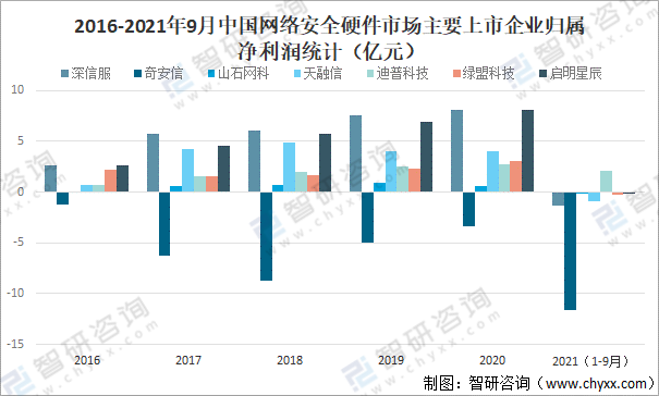2016-2021年9月中国网络安全硬件市场主要上市企业归属净利润统计(亿元)