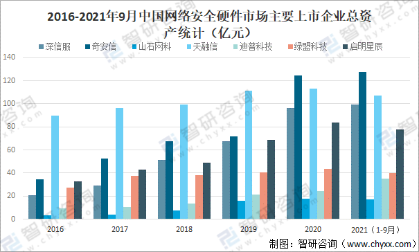 2016-2021年9月中国网络安全硬件市场主要上市企业总资产统计(亿元)