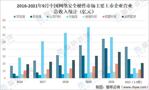 2016-2021年9月中国网络安全硬件市场主要上市企业营业总收入统计(亿元)